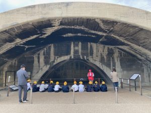 2025年11月19日 掩体壕に市内小学生が見学に訪れました。 生石地区まちづくり協議会のボランティアガイドの説明を 真剣に聞いてくれています。 #生石地区 #まちづくり #掩体壕